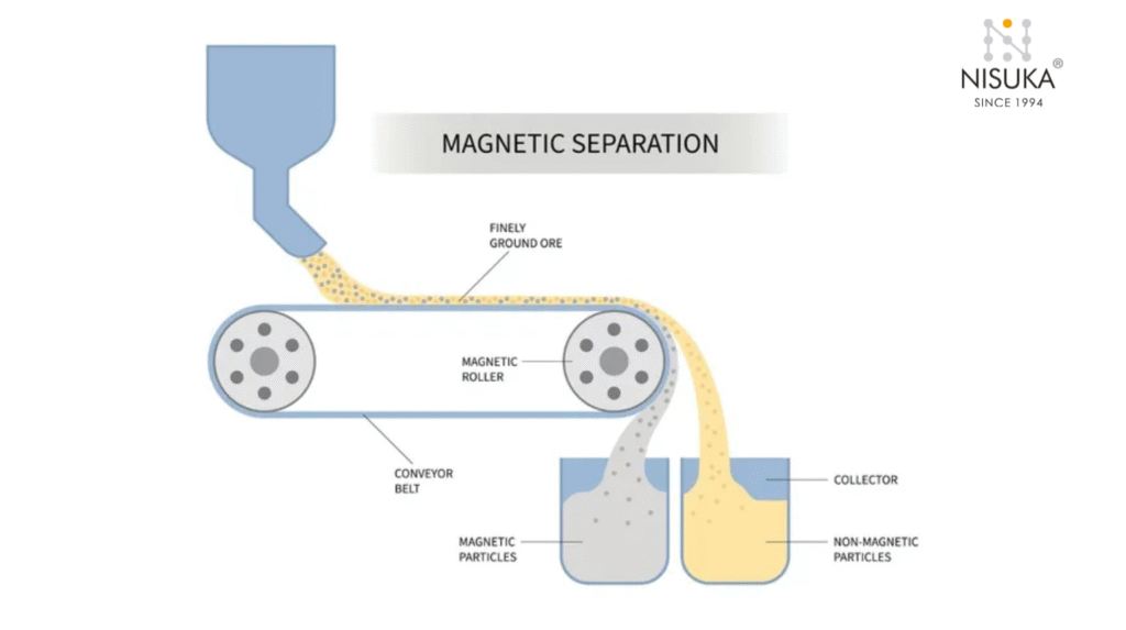 Magnetic Separation removes ferrous metals like iron, steel, and magnetite. It also works for weakly magnetic materials such as hematite or pyrrhotite. However, it cannot separate non-magnetic substances like aluminum, copper, or glass.